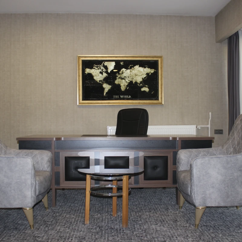 Profesyonel ihtiyaçlar düşünülerek tasarlanan çalışma bölümünde; geniş bir çalışma masası, ziyaretçi koltukları ve evrak dolapları bulunur. İşlerinizi verimli bir şekilde sürdürebileceğiniz bu özel alan, konaklamanız sırasında odaklanmanız gereken tüm görevler için mükemmel bir ortam oluşturur.
